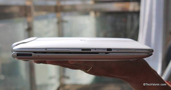 Asus Transformer Pad TF300 has a 10.1″ inch IPS display protected by a reinforced glass in front of it with plenty of bezel around the edges. Some might argue that a lot of space is wasted but for a 10″ inch display, you do need some amount of space around the display in order to avoid accidental touches. At the back, on the top there’s a camera positioned to the center and a rear speaker to the left. Around the sides there is a 3.5 mm audio jack located at the top right accompanied by volume rocker at the top left with a micro-HDMI and microSD card slot below that. The power/screen on-off multi-purpose button is on the top left. In short there’s nothing out of the world about the design of the device.