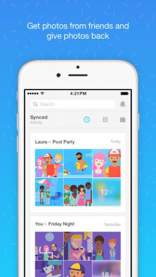 Moments also keeps all of your synced photos organized and even lets you search them to find the ones that you or specific friends are in. Moments also automatically creates beautiful movie compilations of your best photos, synchronized to music, that you can quickly customize and share with friends.
