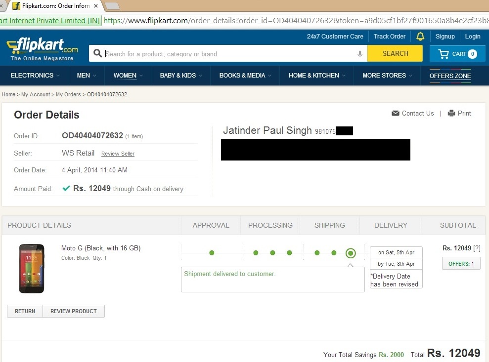 UPDATE: It has been really disappointing to see the reaction of the readers towards this article. I am not sure what is causing them to believe this is a “paid” article (which is not). Moreover as a proof that the delivery was really made as mentioned, I am sharing the screenshot of the order page.