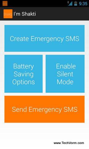 In terms of usability, there isn’t much to talk about. The app offers a single screen UI with options to “Create Emergency SMS” which will be sent to emergency contacts; “Send Emergency SMS” to dispatch the emergency sms and Battery Saving, Enable Silent Mode options (which are totally out of place considering the core functionality of this app). I’m Shakti allows you to send emergency sms to any number of contacts, there’s no upper limit. You can set the Emergency Contacts by simply tapping in to “Preferences” screen.