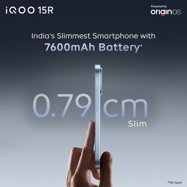 The iQOO 15R packs a massive 7600 mAh battery supported by 100W FlashCharge. On the camera front, the device features a 50MP Sony LYT-700V OIS camera and an 8MP ultrawide-angle, to capture images with clarity and depth. It runs on OriginOS 6, and will come with 4 years of OS updates and 6 years of security updates. This ensures users can enjoy the latest features, performance optimizations, and security enhancements for years to come. With One Tap Transfer, users can move apps, data, and memories across Android and iOS in seconds.
