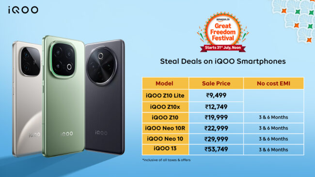 iQOO has announced attractive deals on its smartphones like iQOO Z10 Lite, iQOO Z10x, iQOO Z10, iQOO Neo 10R, iQOO Neo 10 and iQOO 13 during the Amazon Great Freedom Festival Sale 2025. The sale will be live today at 12 noon on Amazon.in. Prime members now have early access to the Amazon Great Freedom Sale.