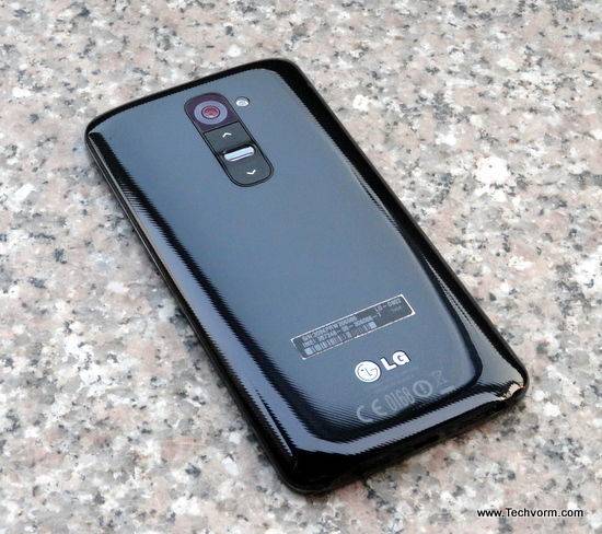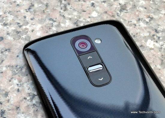 Onto the more noticeable features, the front of the LG G2 consists of a single piece of toughened glass protecting the 5.2″ IPS panel. The uniformity complimented by edge-to-edge display, absence of hardware buttons looks classy and neat. The back of G2 is rather disappointing, made of smooth plastic with noticeable diagonal highlights, it fails to instill a sense of holding a ‘premium’ device and not to forget the finger print magnet it is.
