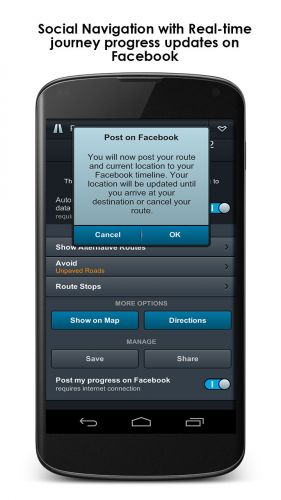 MapmIndia NaviMaps - Screenshot 6The MapmyIndia NaviMaps allows users to share location and routes via Facebook with the feature of real-time journey progress sharing on Facebook to update friends on road-trips. With this feature your journey progress will be updated on the Facebook timeline. The post will be refreshed periodically.