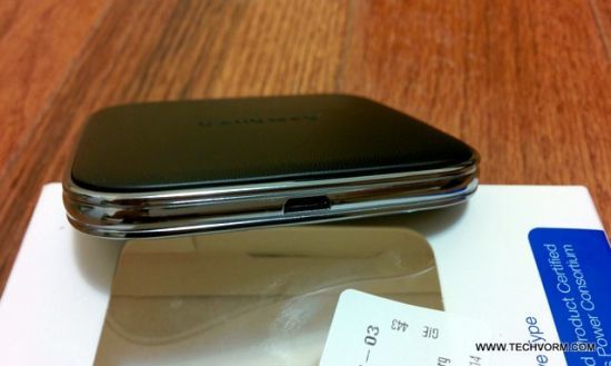 Starting with the contents of packaging, not much came with the unit, just the S Charger Pad itself. There wasn’t even a supporting USB cable present let along a power cord. The base of charging pad has a leather finish to it whereas the edges sport a chrome finish which does indeed look attractive and gives a premium finish to product. One thing to note here is that unlike the nexus charger, there isn’t any rubberized corner in order to keep the phone from slipping. The bottom of pad is rubberized thus ensuring that the pad itself doesn’t slip or move around when placed on a flat surface.