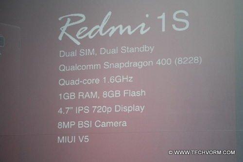 Xiaomi Redmi 1S sports  a 4.7-inch 720×1280 pixel IPS-LCD display having Corning Gorilla Glass 2 protection, and is driven by a 1.6GHz quad-core Snapdragon 400 processor with Adreno 305 GPU and coupled with 1GB of RAM and  8GB of built-in storage, which is expandable to 32GB via microSD card. This smartphone is also equipped with an 8-megapixel rear autofocus camera with flash and a 1.3-megapixel front-facing camera for video-calling and selfies.