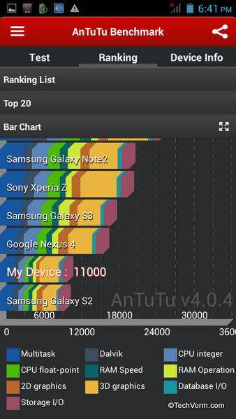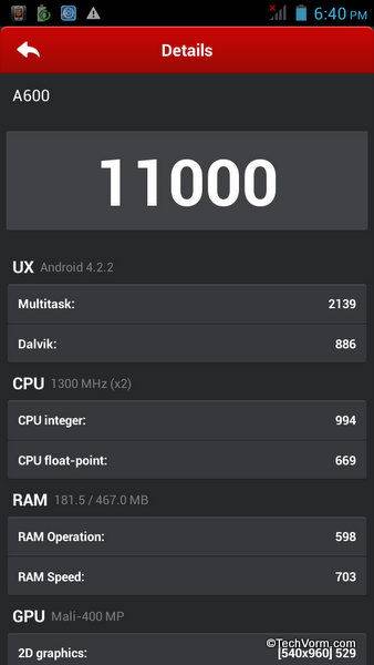Xolo A600 comes with 512 MB RAM, 4 GB internal storage and support for external micro SD card (of up to 32 GB). Out of the available 4 GB internal storage, roughly 1.2 GB is available for as application storage and 1.27 GB is at users disposal. The internal storage might seem heavily constrained but thankfully support for external SD card makes up for it. I can live with this but what I cannot live without is the RAM, Xolo A600 has only meager 512 MB RAM. They could have put in at-least 768 MB RAM if not more. I don’t expect 1 GB RAM module in a sub 10K phone but considering the competition 768 MB would have been much better.